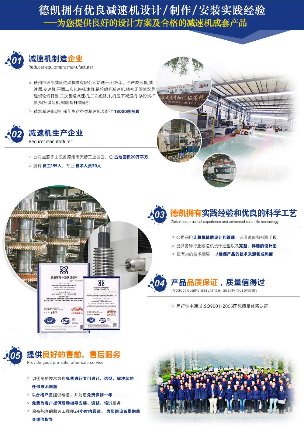 德州市德凱減速傳動機(jī)械有限公司,生產(chǎn)減速機(jī),減速器,變速機(jī),平面二次包絡(luò)減速機(jī),蝸輪蝸桿減速機(jī),精密無間隙雙導(dǎo)程蝸輪蝸桿副,二次包絡(luò)減速機(jī),蝸輪蝸桿,軋機(jī)壓下減速機(jī),蝸輪蝸桿副,蝸桿減速機(jī),蝸輪蝸桿減速機(jī),公司占地面積20萬平方,員工155人,技術(shù)人員30人,年生產(chǎn)各類減速機(jī)及配件18000余臺套。在同行業(yè)中通過了ISO9001質(zhì)量管理體系認(rèn)證。公司設(shè)備齊全、技術(shù)力量強(qiáng)大、檢測手段完善,引進(jìn)國外大型數(shù)控二次包絡(luò)機(jī)床GJK75加工數(shù)控4臺,可加工到800二次包絡(luò)蝸輪蝸桿。引進(jìn)漢江S7732蝸桿磨床3臺,精度可達(dá)5級。公司擁有輝光離子氮化爐4臺,經(jīng)該設(shè)備氮化后可提高蝸桿表面硬度、耐磨性高、提高疲勞強(qiáng)度、變形量小、耐蝕性、...